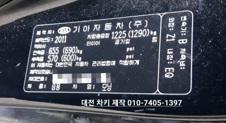문을 열고 실내로 진입합니다. 먼저 차량 정보 스티커를 확인합니다. 이 정보에서 키 코딩에 필요한 정보를 확보할 수 있습니다. 전용 장비를 사용해서 모닝 스마트키 등록 작업을 진행했는데요. 대전 차키 전문 제작 업체인 저희는 보유하고 있는 장비를 사용해 직접 등록 작업을 진행합니다.